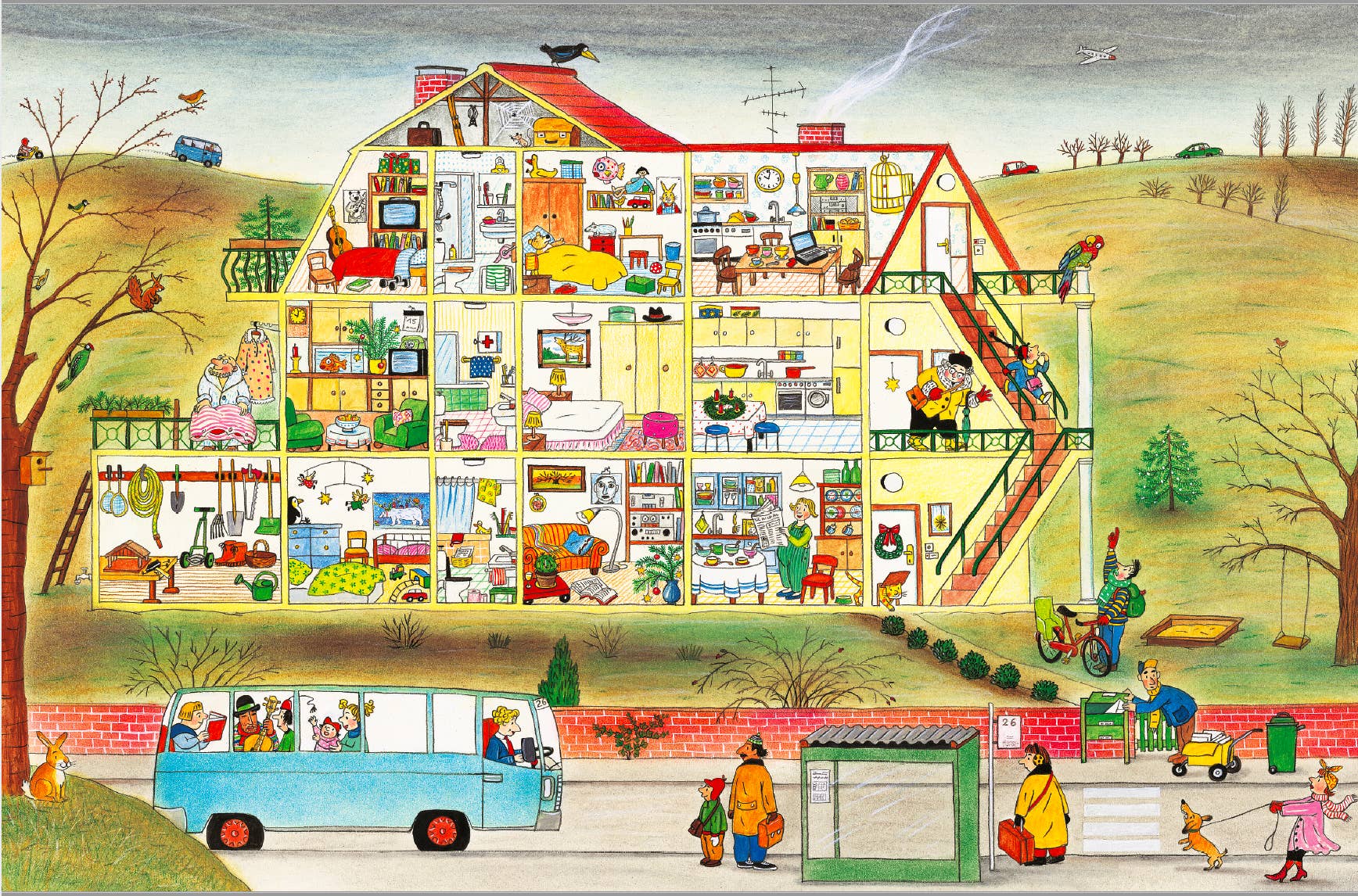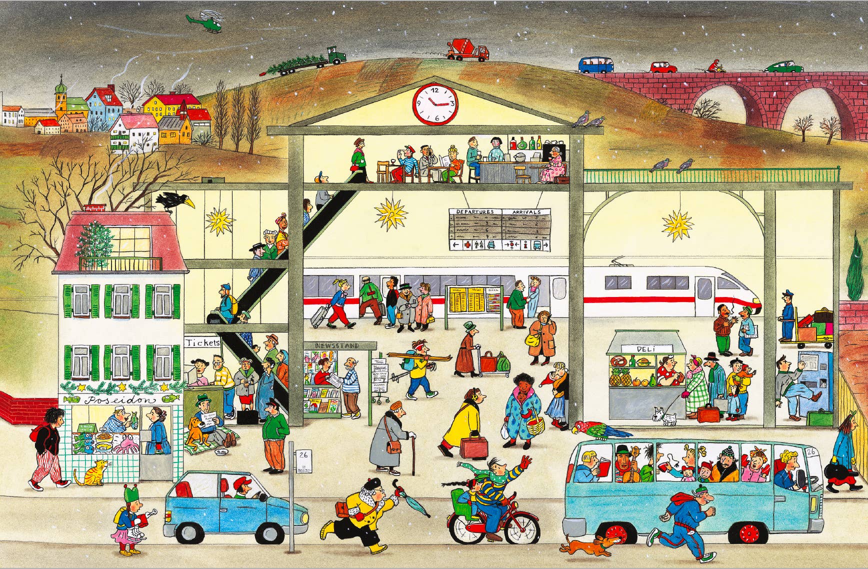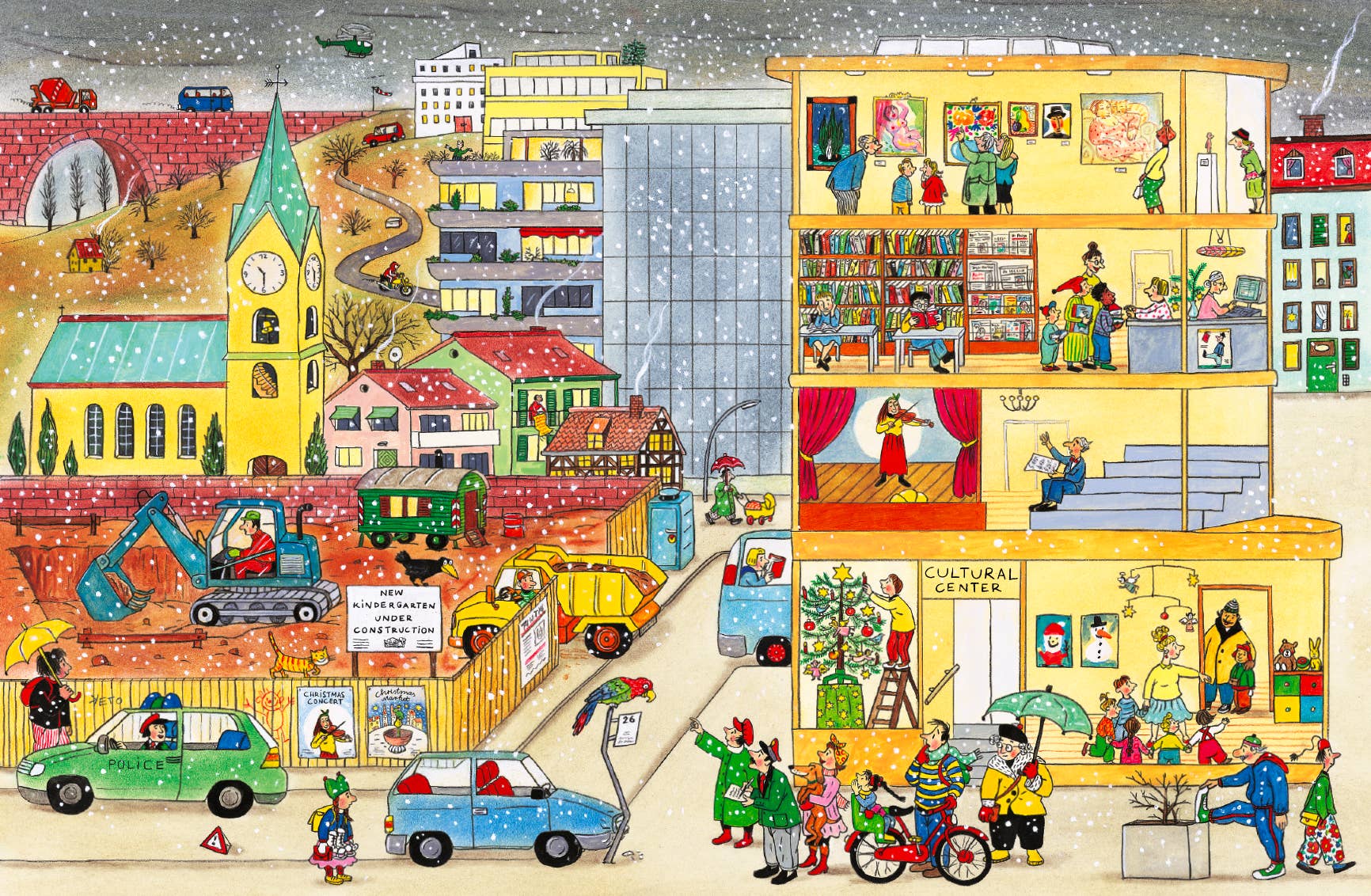 Winter has arrived and everywhere you look people are embracing the season. At home there's baking, reading, and sleeping in, while on the farm the fields are fallow and quiet. Outside people are bundled up against the cold as they are skating, sledding, and running to catch a crowded bus. The town's buildings are alive with activity--piano lessons, a dentist appointment, shopping for presents, and visiting the museum. And if you look closer, you'll recognize the same characters on page after page, each with their own story. Wilfred the jogger has lost his keys, and Erica is shopping for a Christmas tree. Each minutely detailed scene is bursting with different people, such as a cheerful lady with an umbrella and a young violinist, as well as animals and birds.