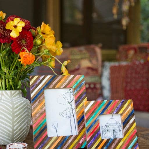 Handcrafted rectangle frame features ethically sourced bone and wood inlay in diagonal ray design with colorful hand-painted accents. Accommodates a 4" x 6" photograph or print. Explore complementary styles within our Banka Mundi Collection. Dimensions: 6.5" L, 8.5" H All of Matr Boomie's collection is handmade, fair trade and sustainable.