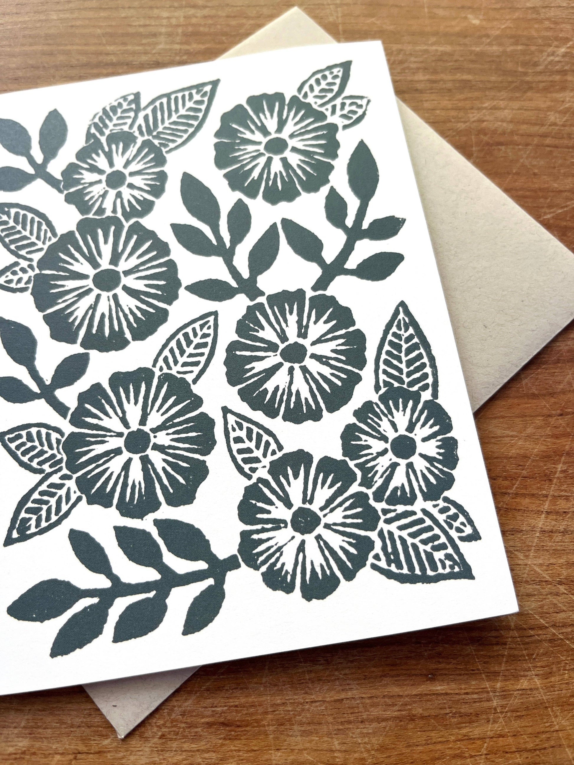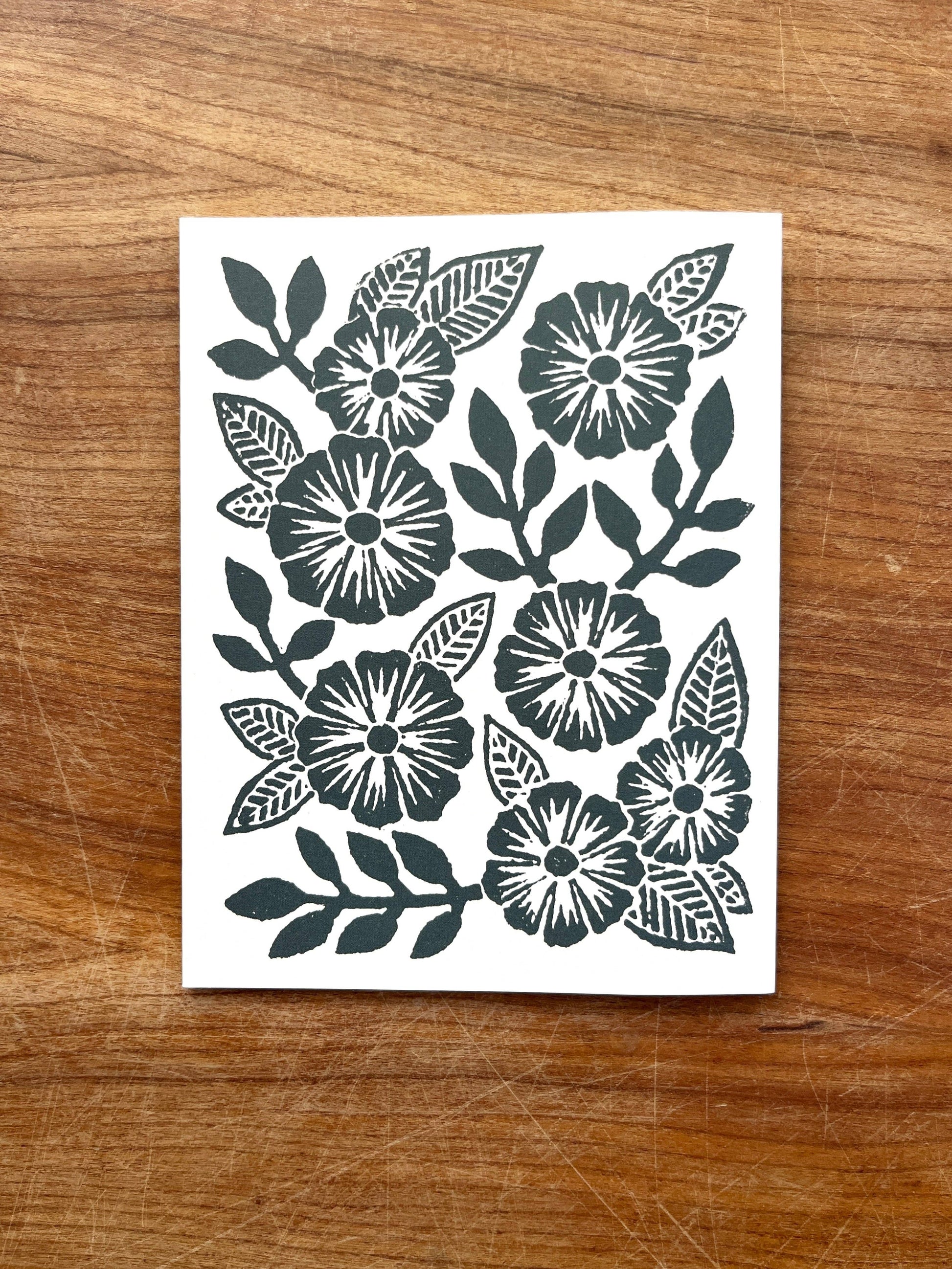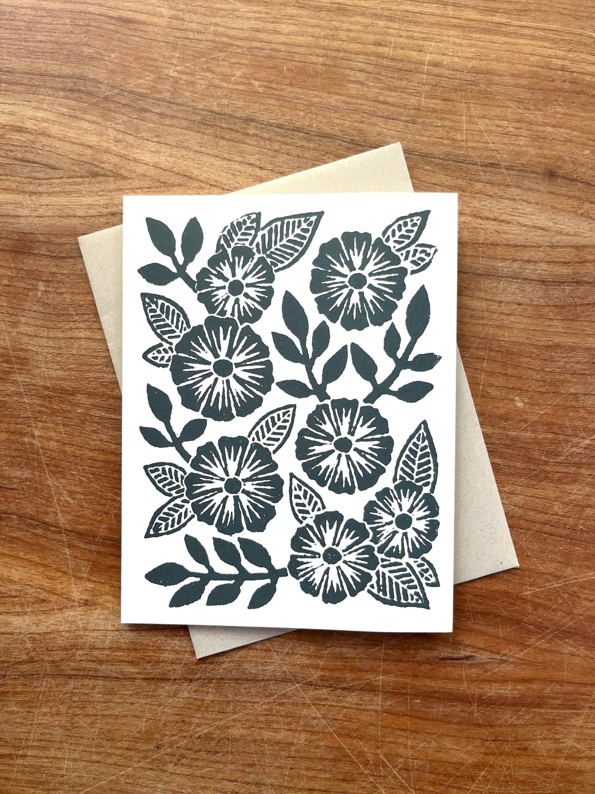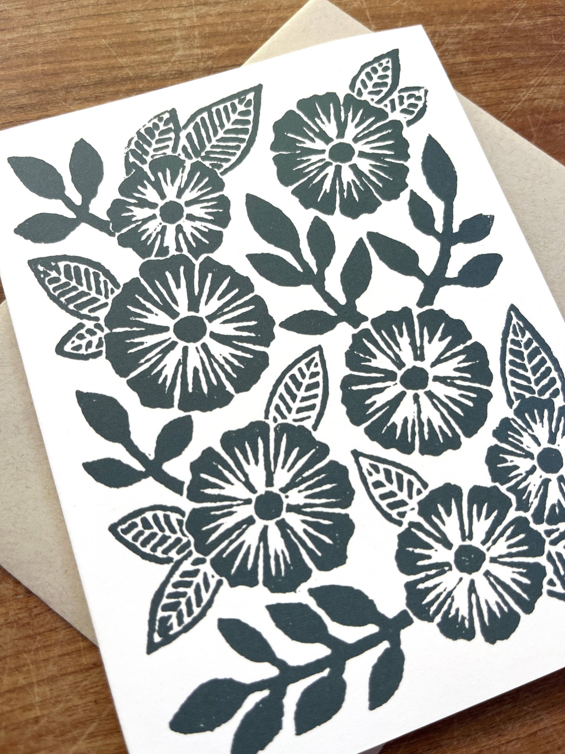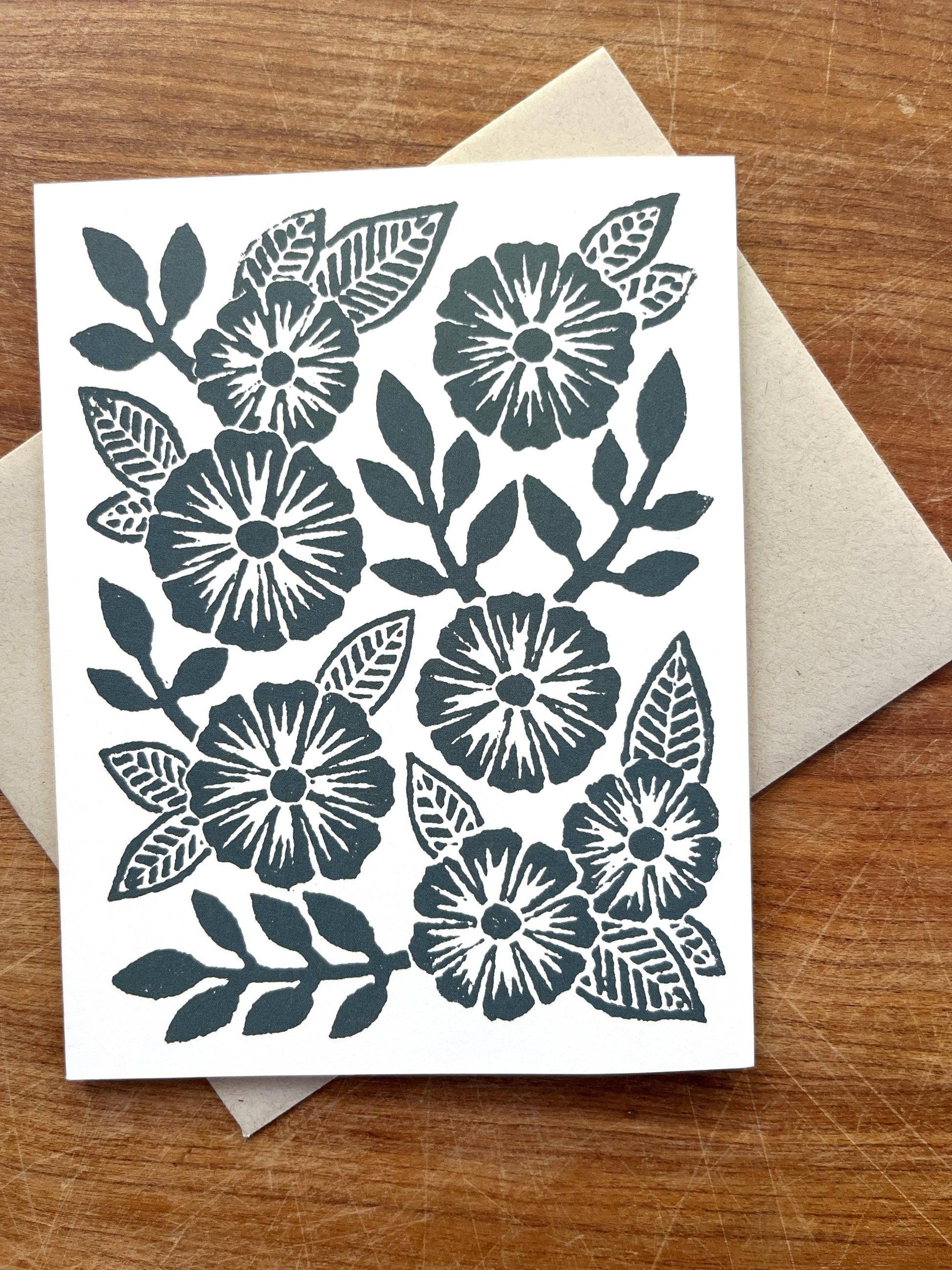 A Katharine Watson offset printed card, printed in Maine on 100lb cream cardstock with deep teal ink. Each card is a standard A2 size, 5 ½” by 4 ¼”, is blank on the inside, and comes with a neutral taupe envelope. For her offset printed cards, Katharine begins each greeting card design with a hand-carved linoleum block, sketch, or watercolor, which is digitally translated and later, individually printed by our local printing partners.