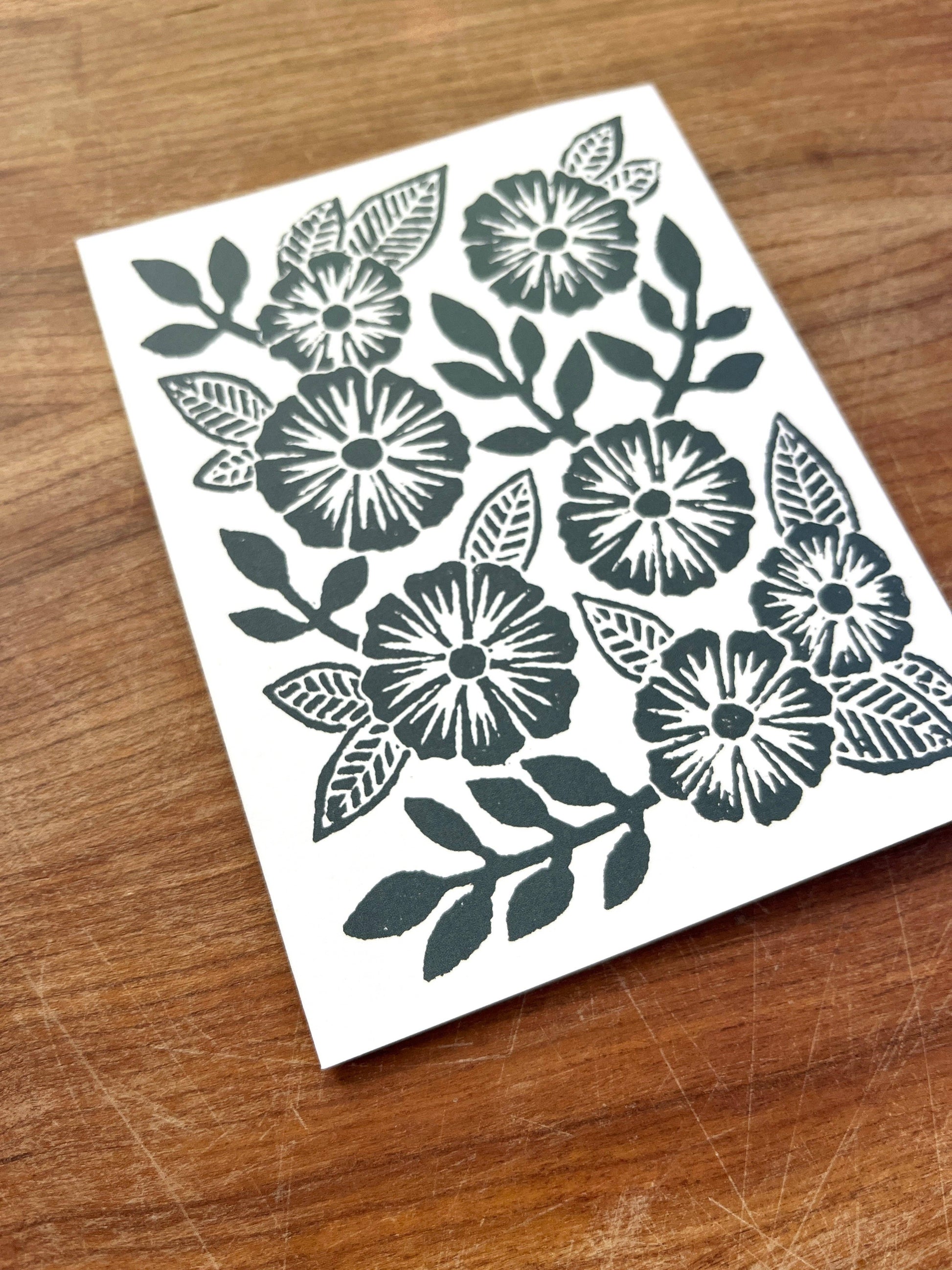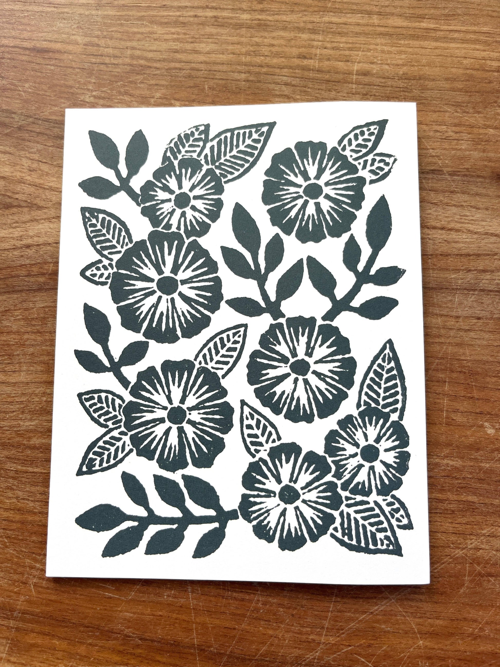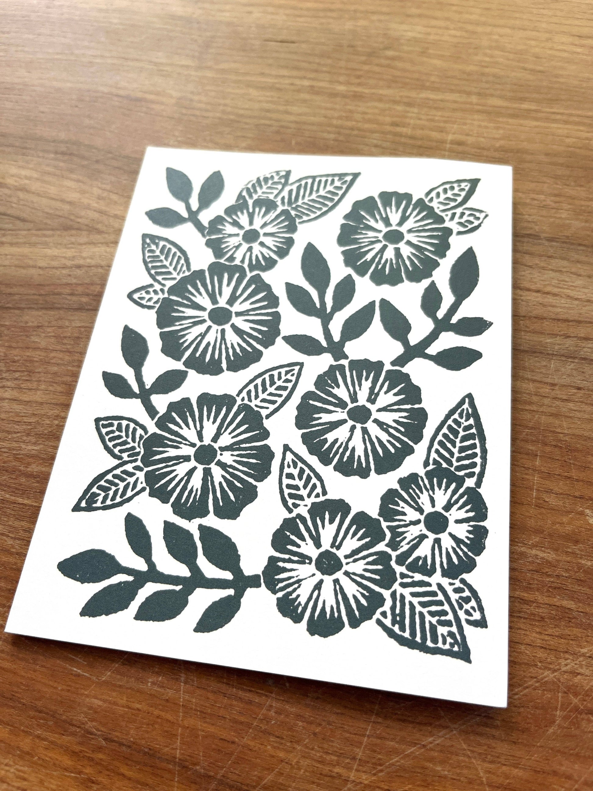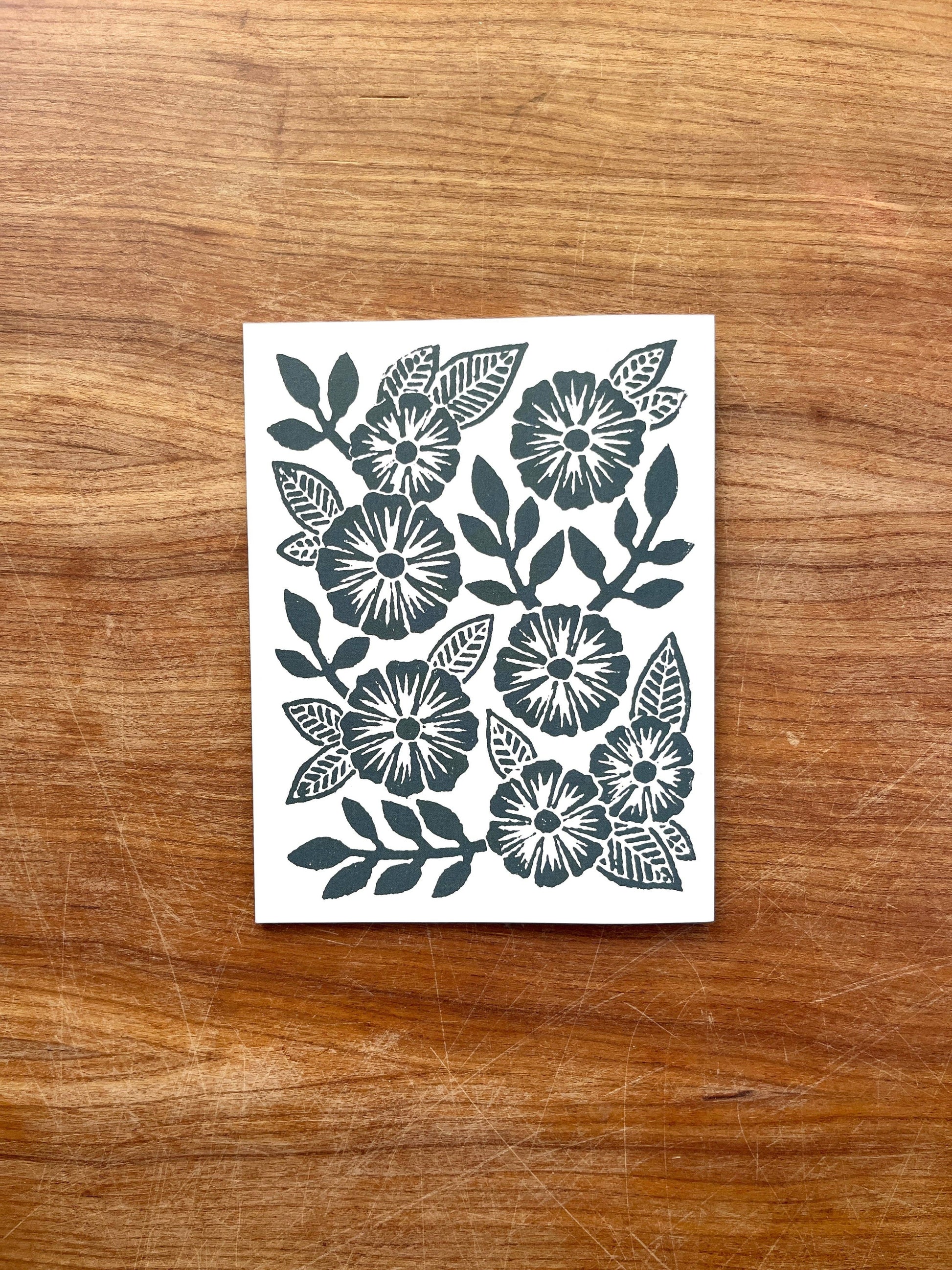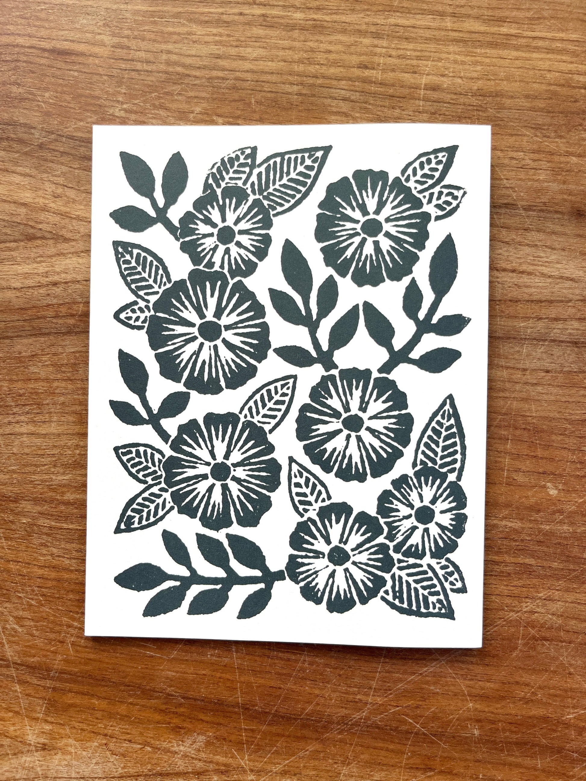 A Katharine Watson offset printed card, printed in Maine on 100lb cream cardstock with deep teal ink. Each card is a standard A2 size, 5 ½” by 4 ¼”, is blank on the inside, and comes with a neutral taupe envelope. For her offset printed cards, Katharine begins each greeting card design with a hand-carved linoleum block, sketch, or watercolor, which is digitally translated and later, individually printed by our local printing partners.