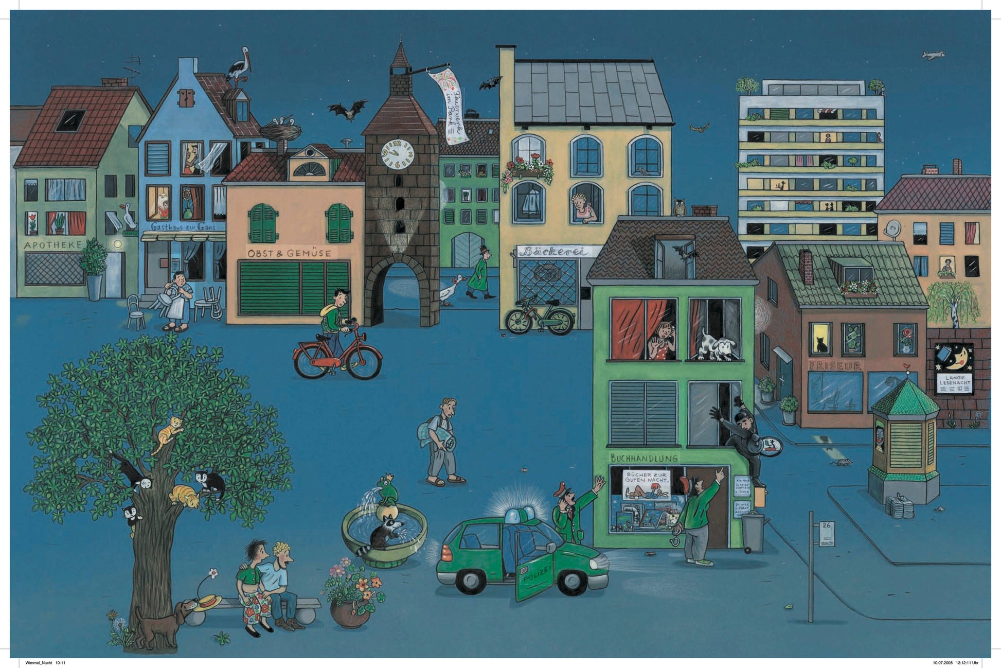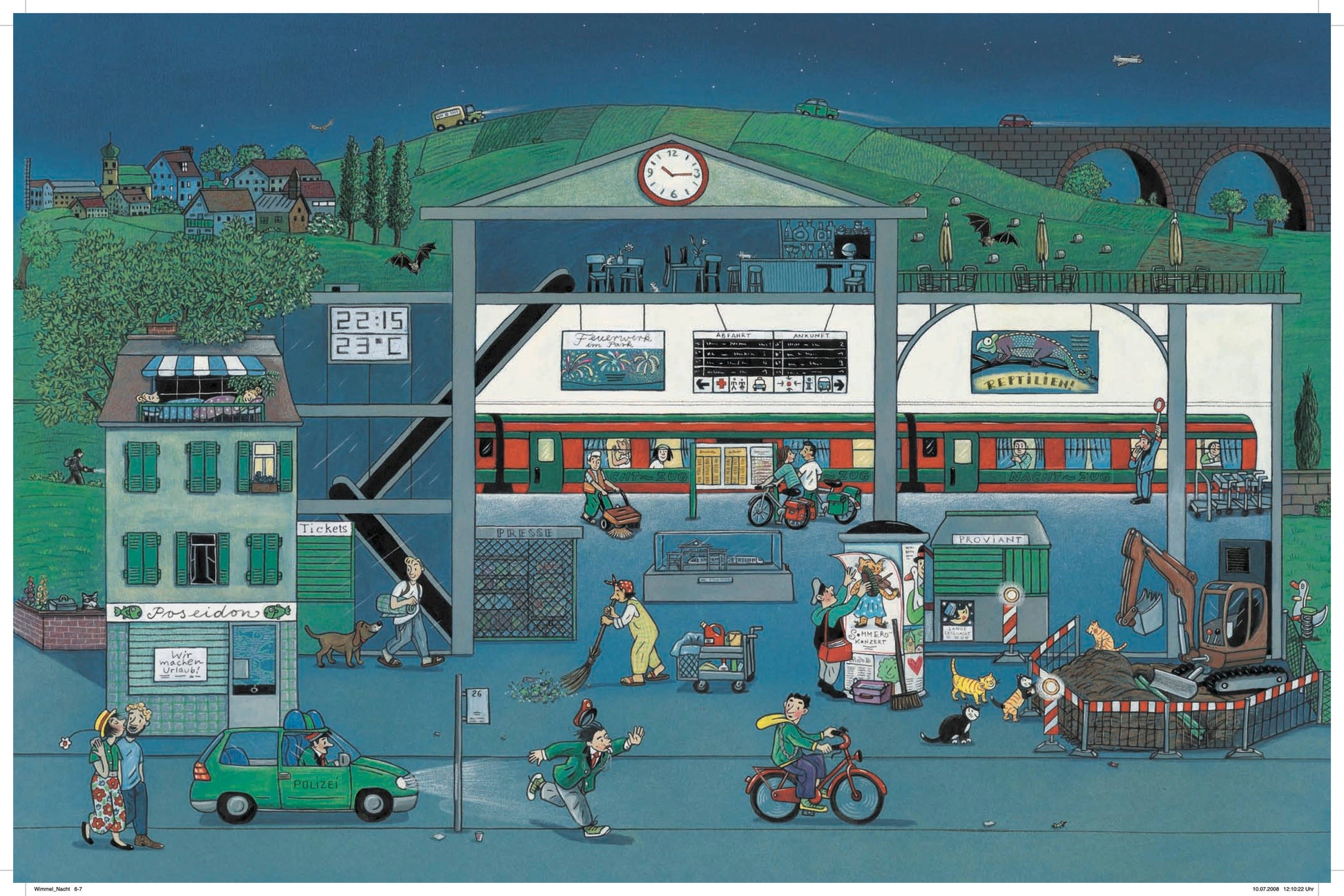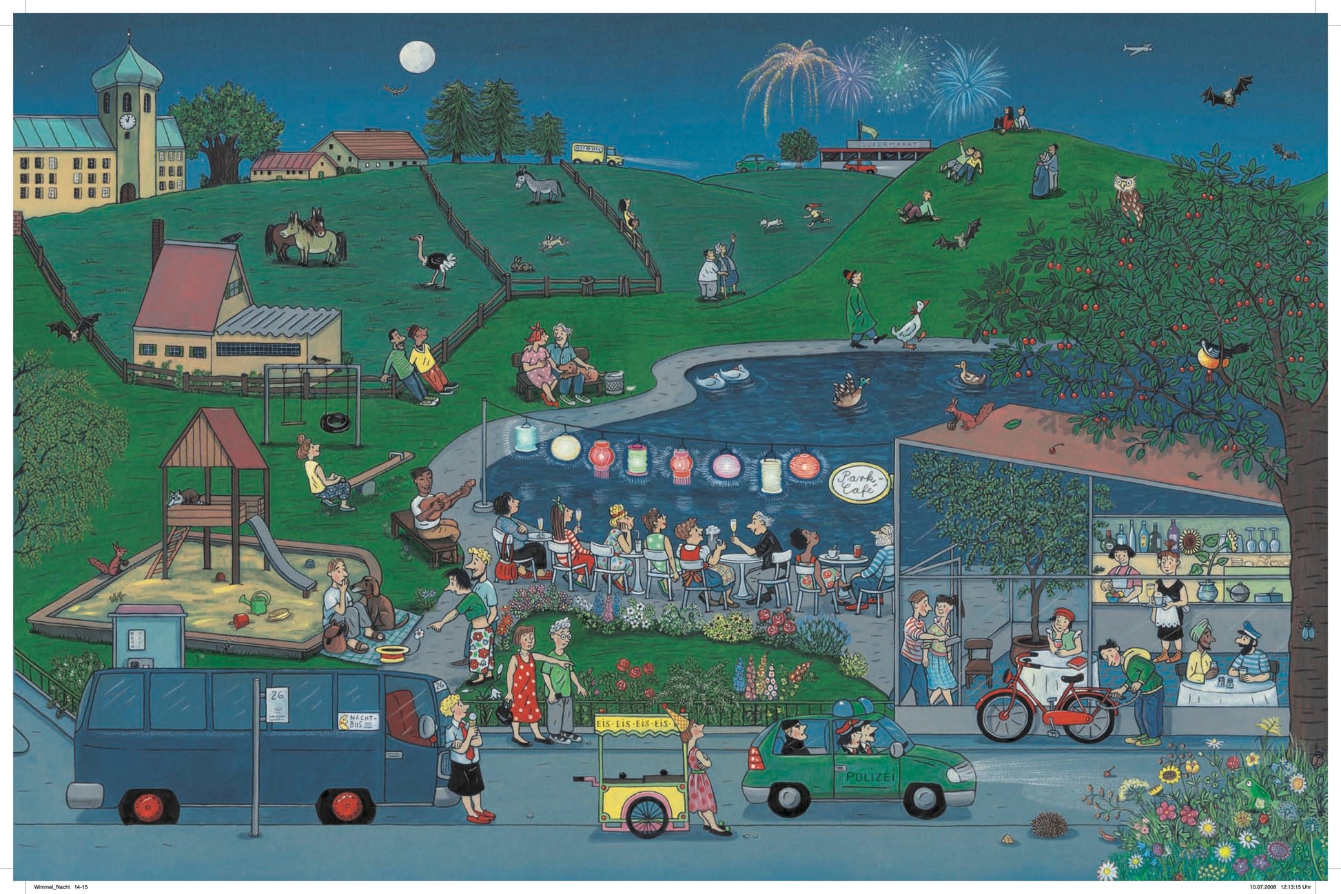 No matter what time of year, the inhabitants of Bustletown are busy working, walking, playing, eating, making music, exercising, and shopping. Now, even though it’s nighttime, the fun hasn’t stopped. Just as Berner’s previous explorations of the town have brilliantly evoked the sights and colors of the seasons, here she bathes the town in shimmering darkness that throws evening activities into fascinating relief. Seven colorful and incredibly detailed spreads take readers inside a multi-generational house, a farm, a railway station, a community center, a marketplace, a department store, and a park with a lake. Readers will return again and again to these pages to discover everything that takes place in Bustletown during the late hours: a burglar tries to break into the dental office, the bookshop features “books for a good night,” fireworks explode above the lake, and a slumber party is raging in the library. And as they search on each