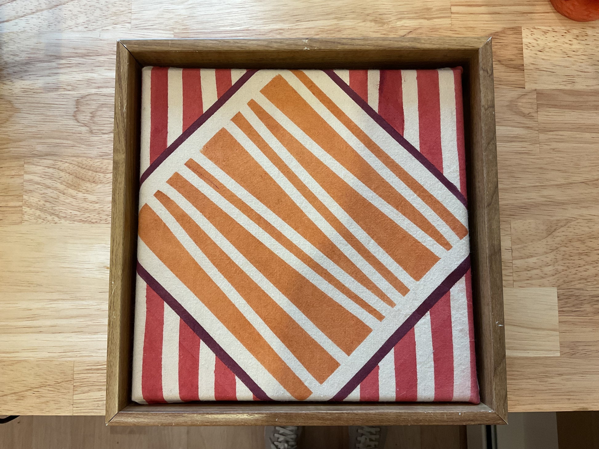 Wood frame orange square painting with natural dye. 9x9”
