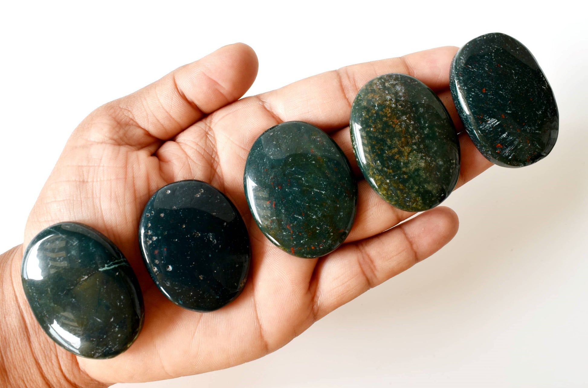 The Bloodstone Crystal Stone is a small, smooth, and polished crystal that fits perfectly in the palm of your hand. It's a rubbing stones for stress relief. It is believed to have healing properties that can help alleviate stress, anxiety, and negative energy. It is also known as the "stone of courage" and is said to enhance vitality and strength.