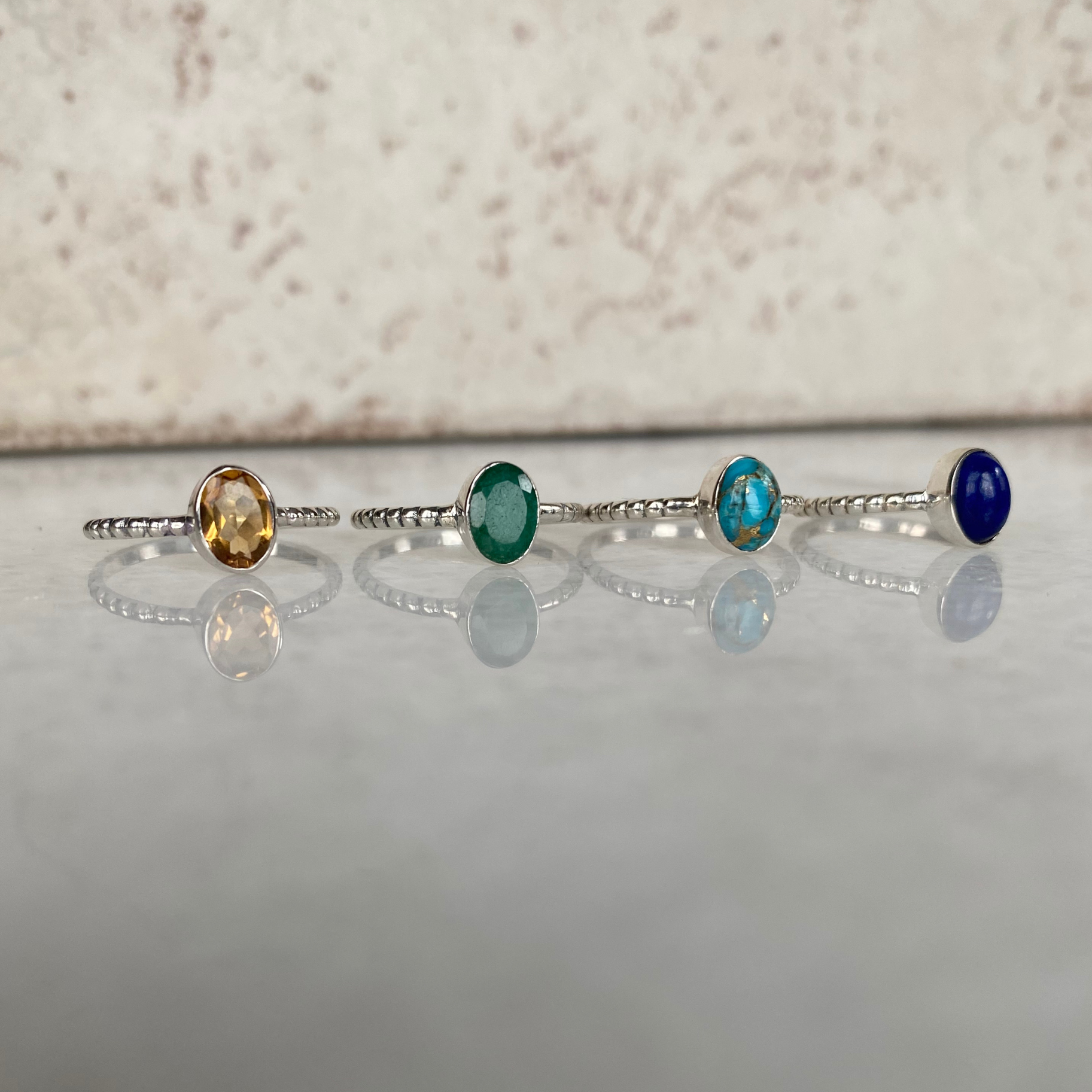 Silver Beaded Band Stone Ring Turquoise Lapis Citrine Oval: 11 / Emerald