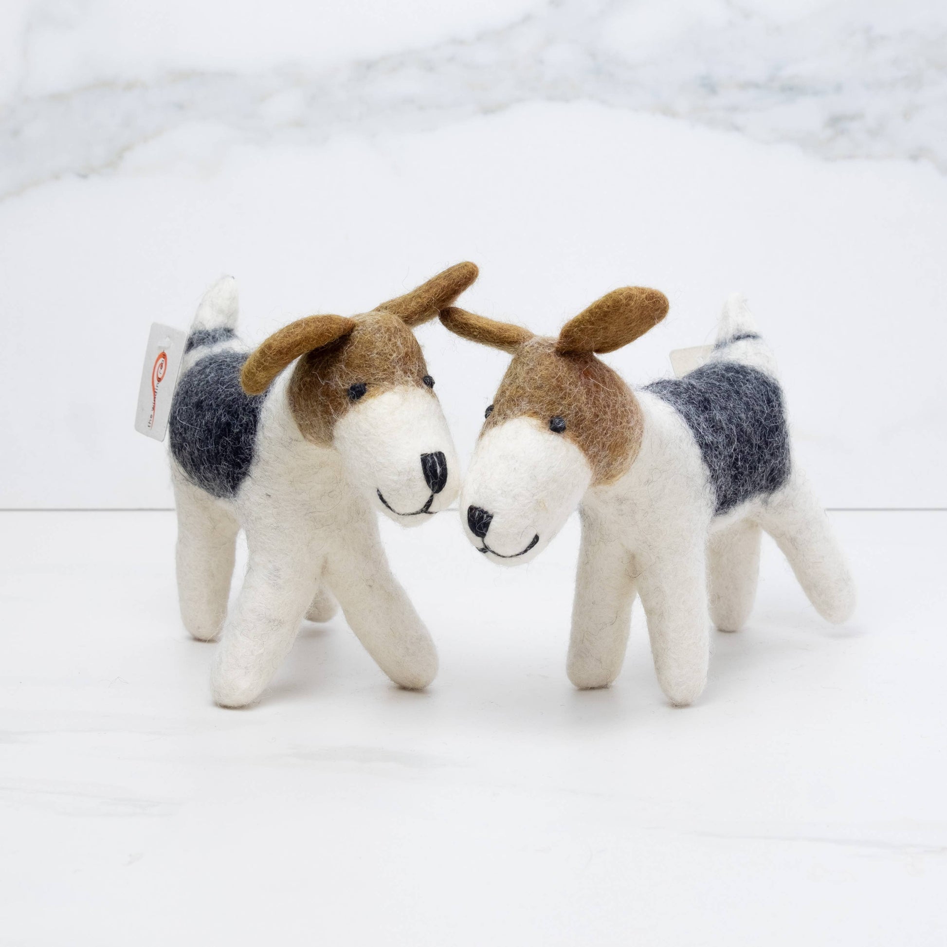 Our hand-felted dog, inspired by the Jack Russell Terrier, is sure to match its spirited and energetic personality in the hands of a child! Our felt doggies are the perfect toy companion to spark your storytelling or playtime adventures! Handmade with care in Kathmandu, Nepal in a small family-owned workshop that follows fair trade practices and strives to improve the standard of living for their artisans. Made from 100% organic wool and Azo free dyes. Approx. 5" High, 2.5" wide and 7" nose to tail. We offer a point-of-sale sign which you can add to your order for $5 - search "Point of Sale" on our product page. The sign brings our story to your store, highlighting our education initiatives