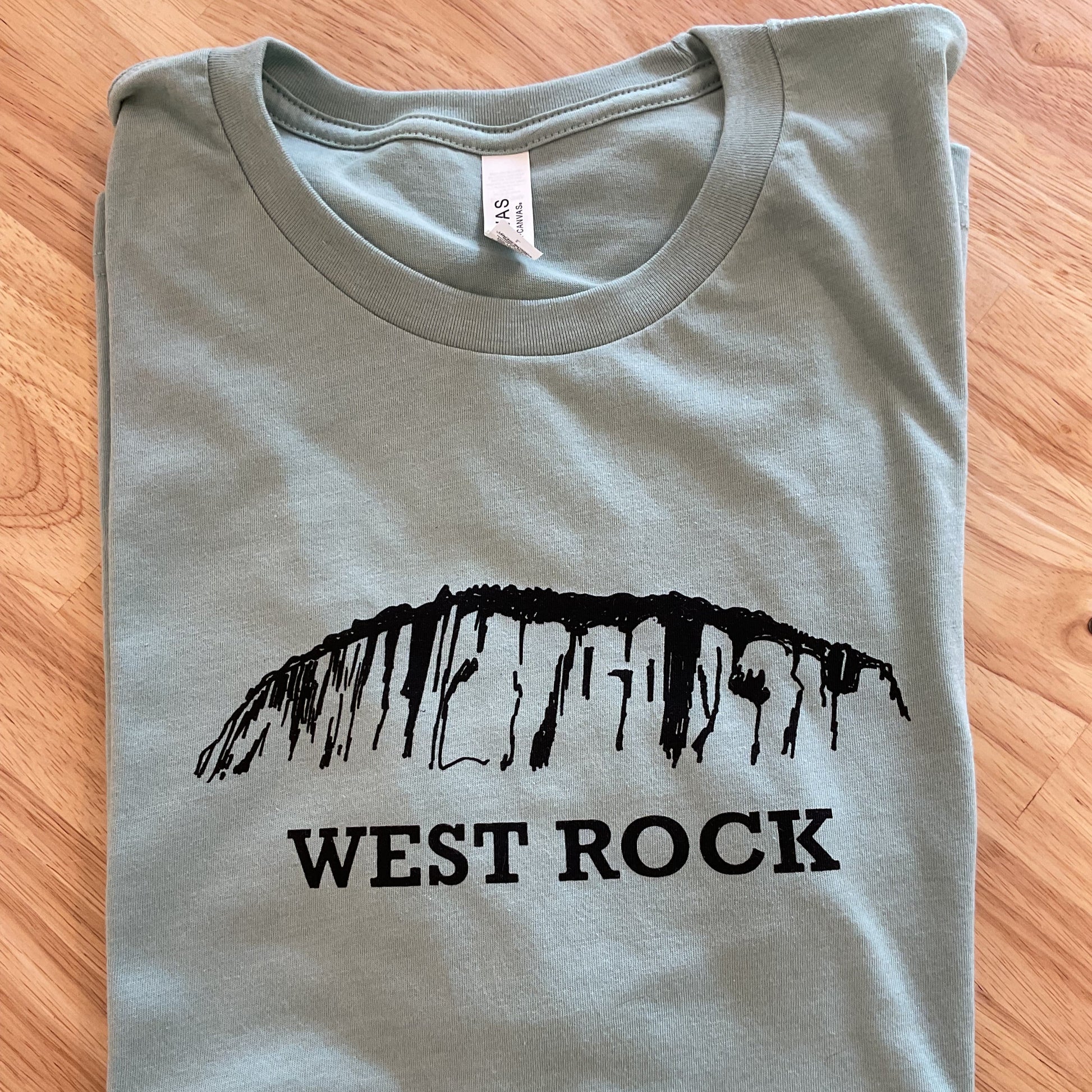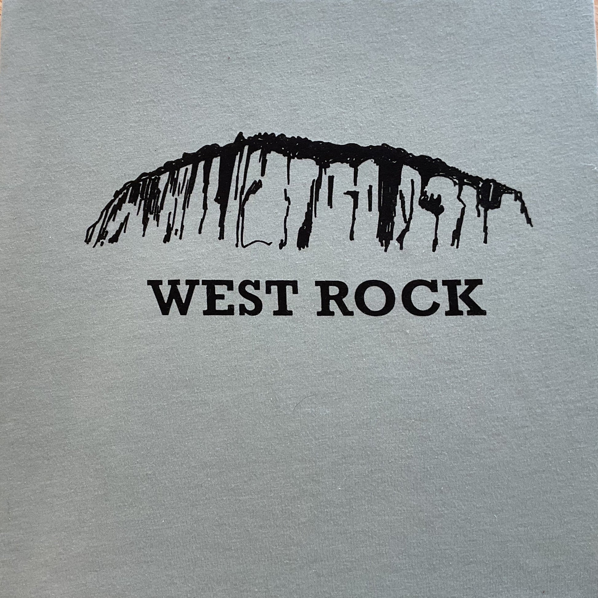 Hand silk screened West Rock T-shirt on sage colored tee. 52% cotton 48% polyester. Also comes in Rust color 100% cotton.